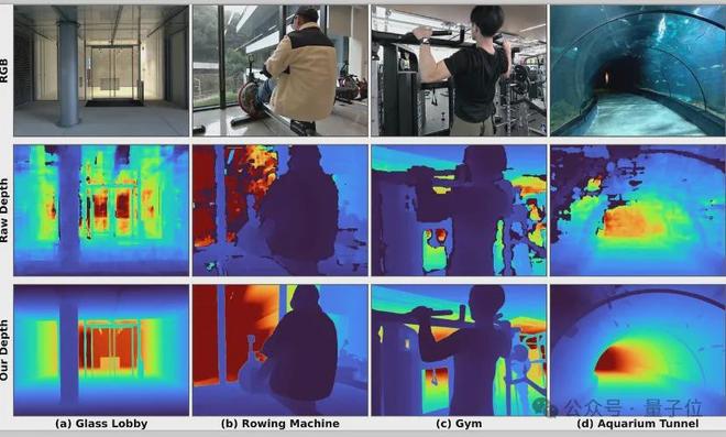在一段包含玻璃大门、有镜子和玻璃的健身房、海洋馆隧道的视频中,LingBot-Depth 输出的深度流不仅填补了原始传感器的大片空洞,而且在整个视频过程中保持平滑、稳定,没有任何闪烁或跳变。