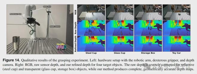 实验目标是抓取一系列对深度感知极具挑战的物体:不锈钢杯、透明玻璃杯、透明收纳盒和玩具车。