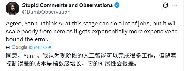 有网友对他的判断表示赞同,认为现在的 AI 也就是能完成些任务,但一旦出错就是真金白银的损失,规模一上来就容易翻车,远没到“放心大胆用”的阶段。这恰好呼应了杨立昆关于错误会像“高速公路上连环撞车”一样堆积的担忧。