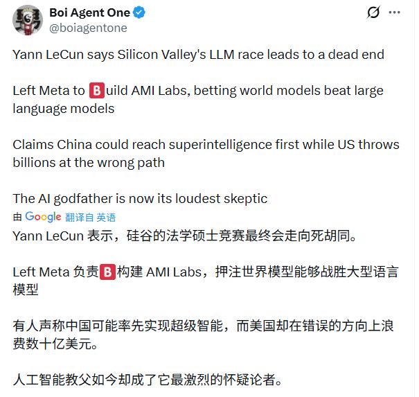 离开 Meta 之后,杨立昆(Yann LeCun)对老东家和整个美国科技界的抨击,已经从单纯的“技术路线”上升到了“文化心态”。