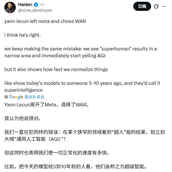 他还称:“我们一直在犯同样的错误:在某个狭窄领域看到‘超人’结果,就立刻大喊‘AGI’!”这恰恰点明了当前业界可能存在的盲目与浮躁。
