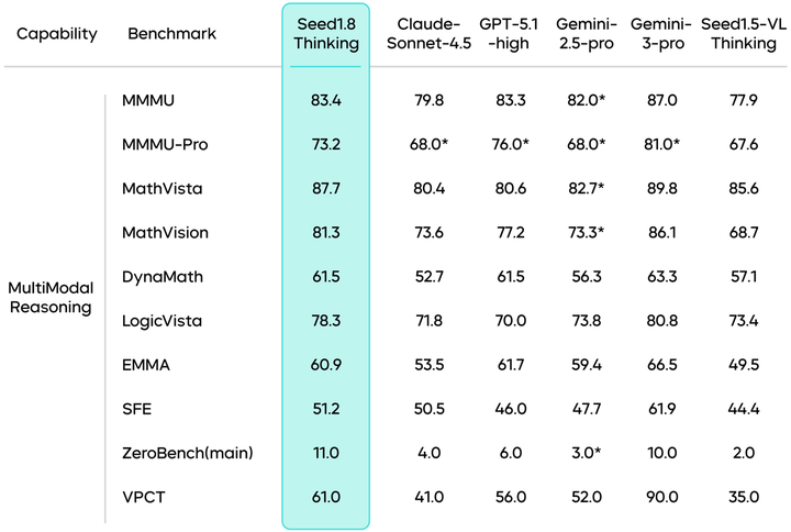 基准测试结果显示,Seed1.8 在多个视觉语言基准测试中表现突出,不仅在多模态推理任务中超越了前代模型 Seed1.5-VL,在大部分任务上的表现甚至已经开始「贴脸开大」,直逼目前最顶尖的 Gemini-3-Pro。