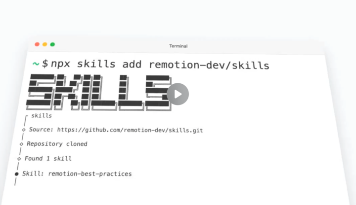 ▲ npx skills add https://github.com/remotion-dev/skills –skill remotion-best-practices