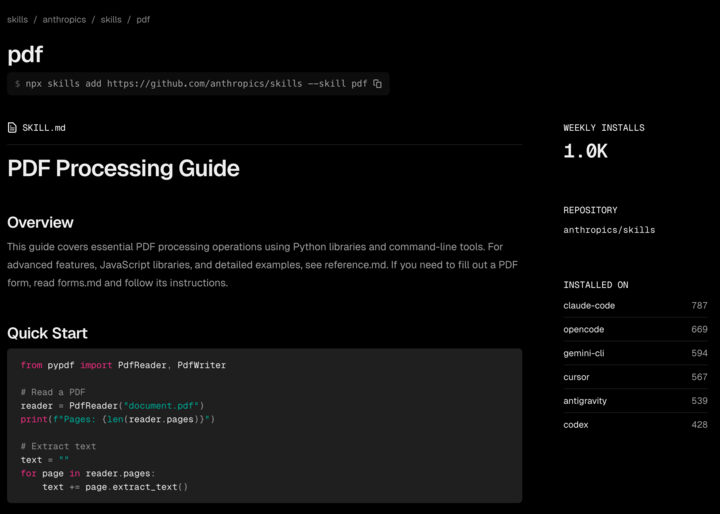和那些 Claude Code 自动安装的库不同,Skills 更像是一个工作流,例如 Claude 官方也给出了一些针对 PDF 文件处理的 Skill。在这个 Skill 里面,不仅仅包含此前提到的 PDF 处理工具,还有更具体的工作流,来应对各种关于 PDF 的任务。