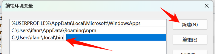 点击新建,然后复制你的终端里面,提示的路径信息,我这里是 C:\Users\ifanr\.local\bin