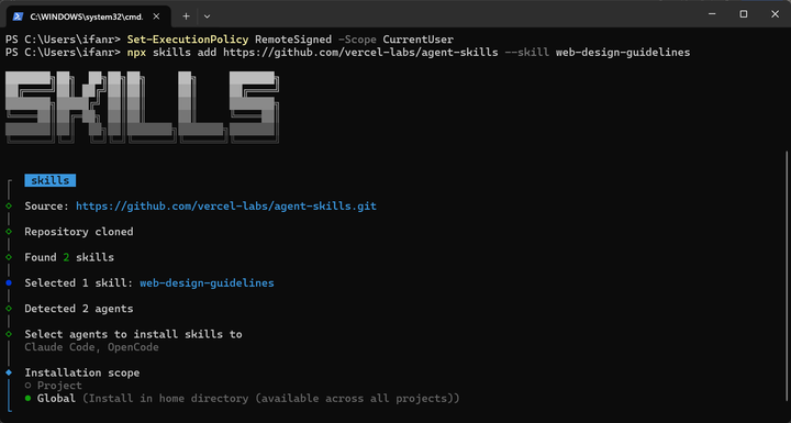 搜索 CMD,打开,输入 y 表示 yes 确定,然后可以选择要安装到哪些应用,选择是否全局安装或只是某个项目,一般我会选择全局安装,如果这个 Skills 不是针对某个特定项目,此外的设置,如安装位置等按照推荐来,直接 Enter,等待安装完成就行。