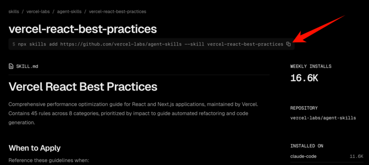 接下来是重头戏,Skills 来了。安装 SKill 特别容易,也是一句命令就能解决。就拿 Claude 官方的 Skills 库来进行说明,它对每个库的介绍,首先都是一句安装命令,我们复制这行命令到终端,