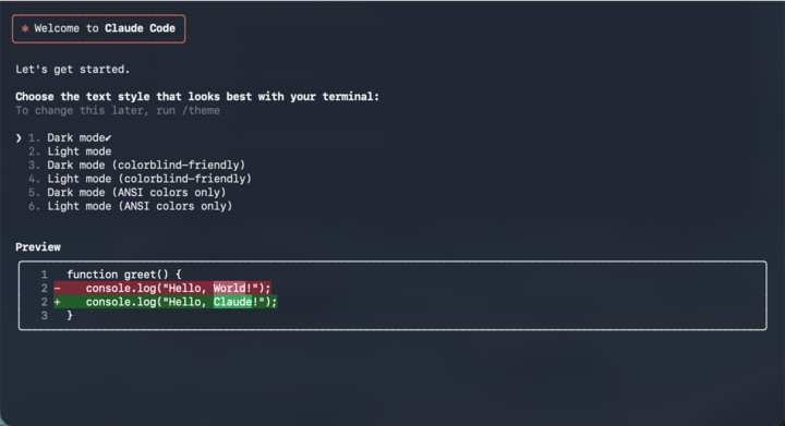 第一次点开,你一定会有诸多不习惯,明明是有很多选项可以选择,但是我不能用鼠标点击,就像这里的主题选择,我们只能使用键盘,上下选择,然后 Enter 表示选中。一般来说,默认第一个 dark mode 暗黑模式即可。