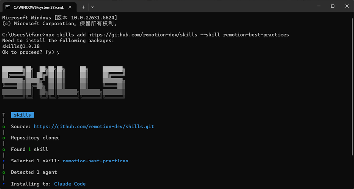 还有一个是最近非常火的,让 Claude 生成视频,通过在 Claude Code 中使用 remotion-best-practices 这个技能,我们可以直接一句话让它生成一个视频。