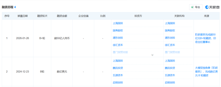 被 DeepSeek 光芒所掩盖的“大模型六小龙”再度翻红,成了资本宠儿。智谱和 MIniMax 已登陆港股,涨幅显著,累计融资超 200 亿元。一个月以内,Kimi 和阶跃星辰又接连完成巨额融资。据天眼查,1 月 26 日,阶跃星辰完成超 50 亿元B+ 轮融资,更刷新了近一年大模型单笔融资纪录。