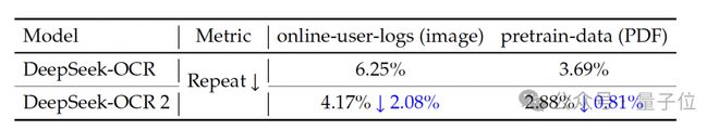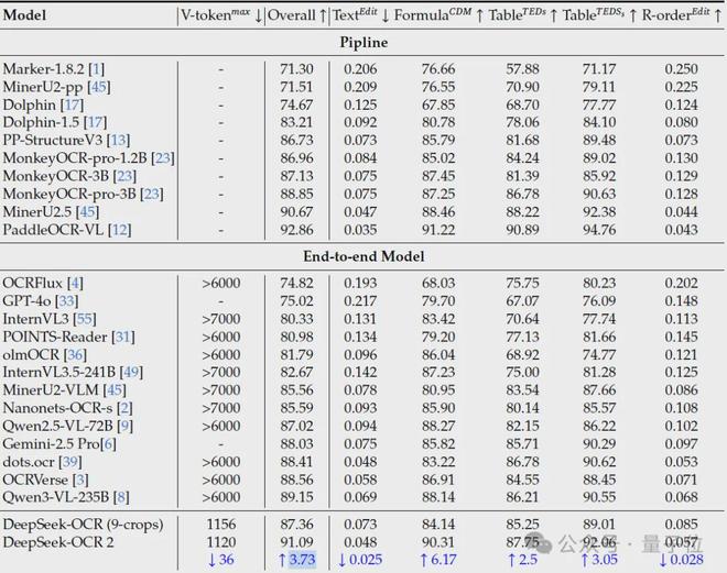 如开头所示,DeepSeek-OCR 2 在 OmniDocBench v1.5 上达到了 91. 09% 的性能,相比基线提升了 3. 73%