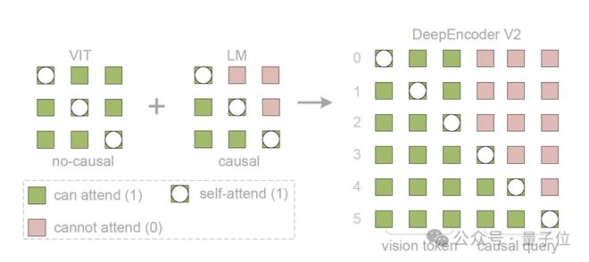 为了实现这种智能重排,DeepEncoder V2 引入了一种全新的双流注意力机制,其底层逻辑通过一个定制的注意力掩码(Attention Mask)来约束: