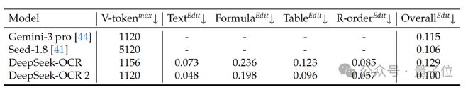 在相似的标记预算(1120)下,DeepSeek-OCR 2 的文档解析编辑距离(0.100)优于 Gemini-3 Pro(0.115)。