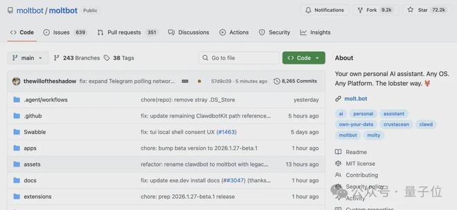 目前其 GitHub 上的Star 量已经超过 72.2k。(当然 GitHub 项目名也已改为 Moltbot 了)