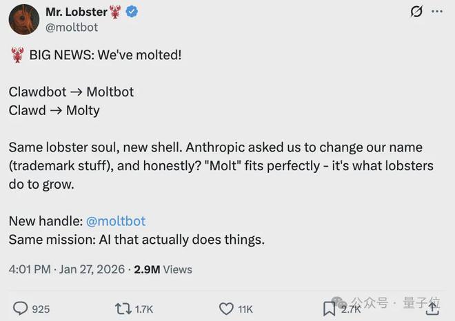 最终他为其取了新名字,叫 Moltbot,取自龙虾的蜕壳行为,既贴合原本的龙虾元素,又规避了商标问题。