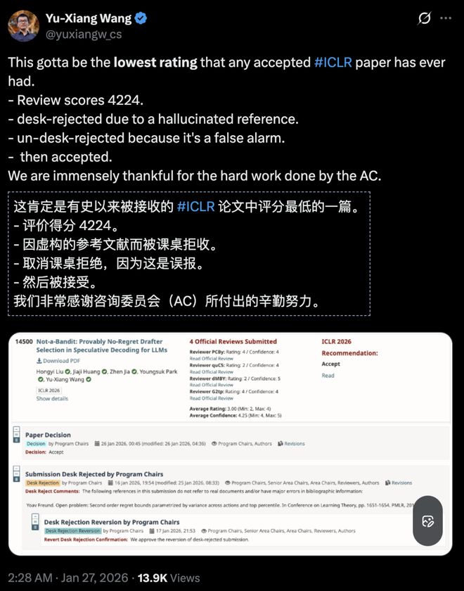 因误报虚构参考文献,被 ICLR 2026 桌面拒稿,最后柳暗花明,Yu-Xiang Wang 分享了「有史以来 ICLR 中稿论文」最低的一篇的故事。