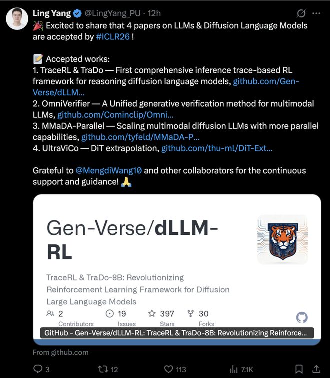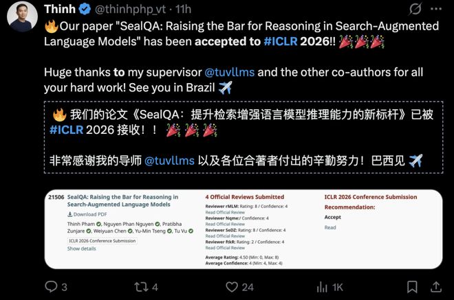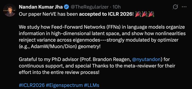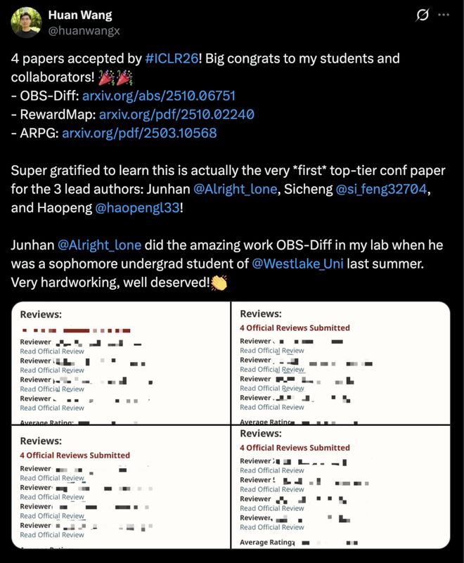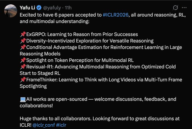 多名作者在国内外社交平台发文,祝贺 ICLR 2026 喜创佳绩。