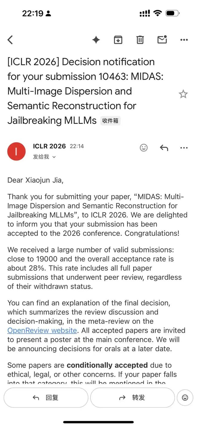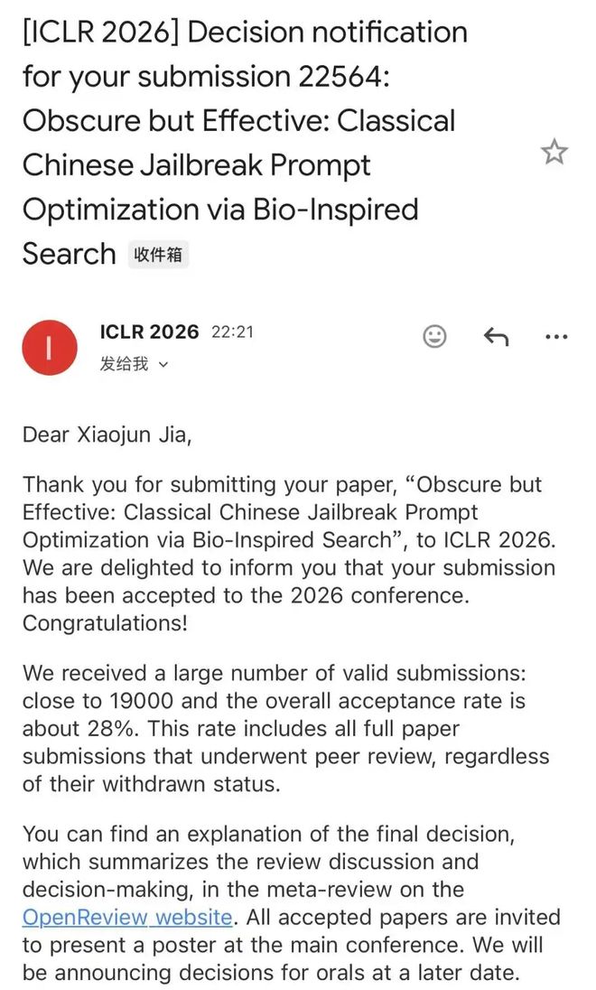 据介绍,本次他参与了三篇 ICLR 2026 论文,其中一篇是共同一作,两篇是通讯作者,分别聚焦 LLM 安全对齐 / 多模态越狱安全评测 /文言文越狱攻击等方向。