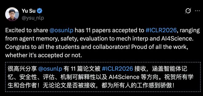 被誉为诺奖风向标之一的斯隆研究奖得主、OSU 教授 Yu Su 实验室中了 11 篇,激动发帖:「OSU NLP Group 中了 11 篇,涉及智能体记忆、安全、评估、机制解释性以及面向科学的 AI 等话题。」