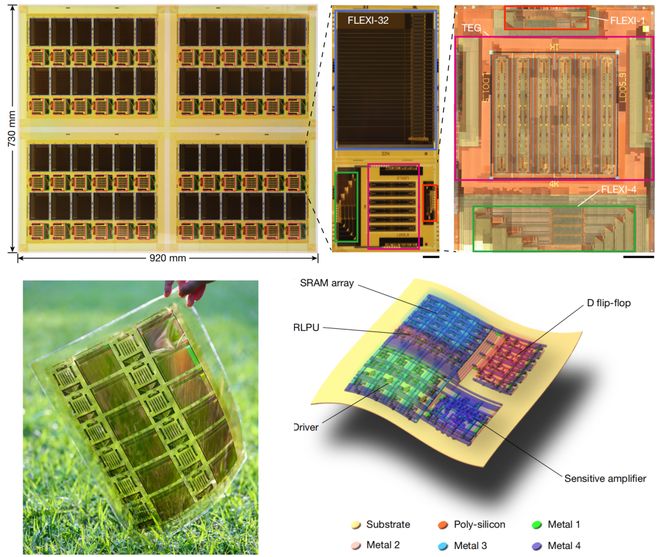 该芯片基于低温多晶硅薄膜晶体管,薄如蝉翼,可随意弯折,并具备超低功耗、高能效与低成本等优势。
