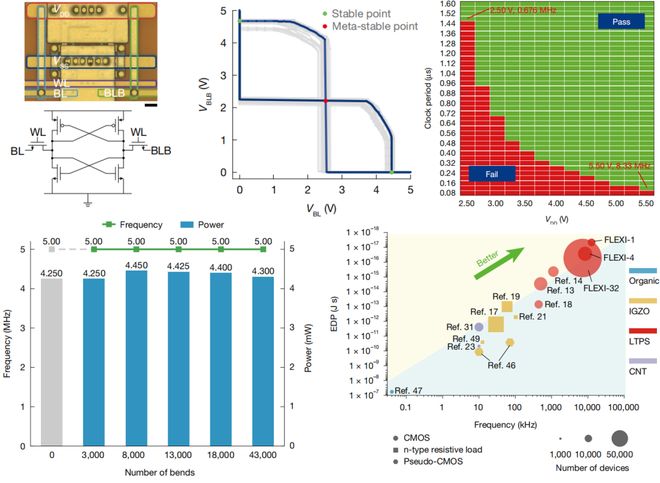 实验结果表明,FLEXI 芯片可在 2.5–5.5 V 电源电压范围内稳定工作,并在半径 1 mm、180° 对折条件下经受超过 4 万次弯折循环而性能无明显退化。