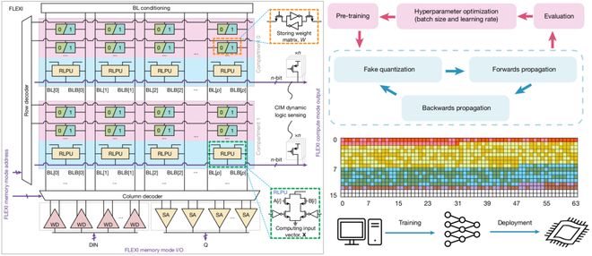 FLEXI 采用模块化、可扩展的数字存算架构,每个模块由 6T-SRAM 单元及嵌入式可重构本地处理单元(RLPU)构成,支持稳定、高速、并行的点积运算。通过覆盖制造工艺、电路设计和算法实现的跨层级协同优化(CLCO)策略,FLEXI 在工艺波动和机械应力条件下仍能保持优异的计算精度、面积效率和能效表现,并高效支持神经网络推理中的单指令多数据(SIMD)运算。