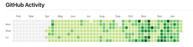 Peter 的 GitHub 热力图,可以看到他从 4 月开始重新写代码。