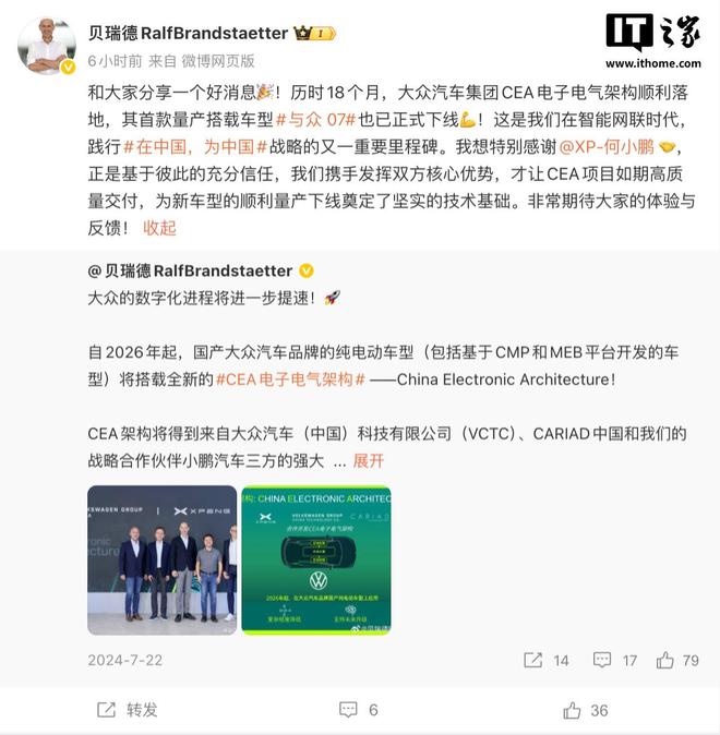 大众中国董事长兼 CEO 贝瑞德也在微博上发文透露,该车是大众在智能网联汽车时代践行“在中国,为中国”战略的又一重要里程碑。“正是基于彼此的充分信任,我们携手发挥双方核心优势,才让 CEA 项目如期高质量交付,为新车型的顺利量产下线奠定了坚实的技术基础。”