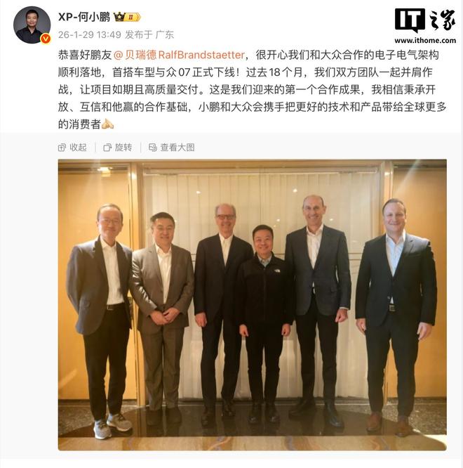 1 月 29 日消息,今天下午,小鹏汽车董事长何小鹏发文称,“很开心我们和大众合作的电子电气架构顺利落地,首搭车型与众 07 正式下线!过去 18 个月,我们双方团队一起并肩作战,让项目如期且高质量交付。这是我们迎来的第一个合作成果,我相信秉承开放、互信和他赢的合作基础,小鹏和大众会携手把更好的技术和产品带给全球更多的消费者。”