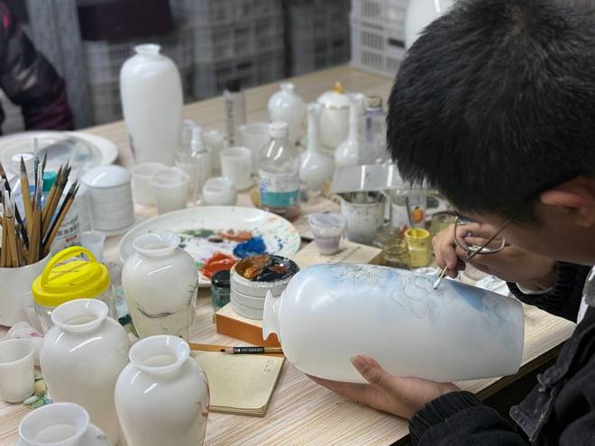 图说:德化一位年轻的画师在工作间为白瓷花瓶画手绘龙纹。