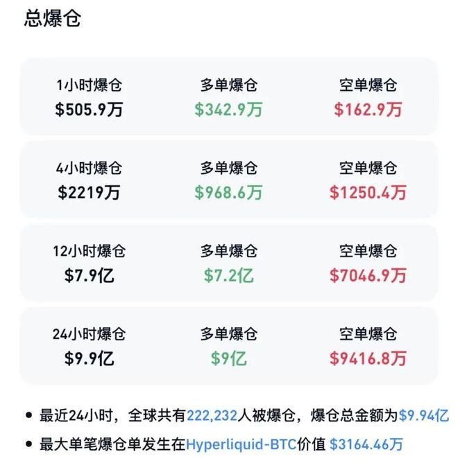 Coinglass 数据显示,过去 24 小时加密货币市场共有超 22 万人被爆仓,爆仓总金额为 9.94 亿美元,其中多单爆仓 9 亿美元,空单爆仓 9416.8 万美元。