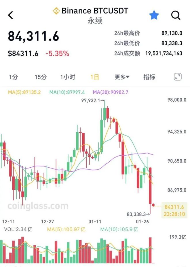 加密货币市场跌幅进一步扩大,比特币下探触及 83338.3 美元/枚,最新报 84311.6 美元/枚,24 小时跌幅达 5.32%。