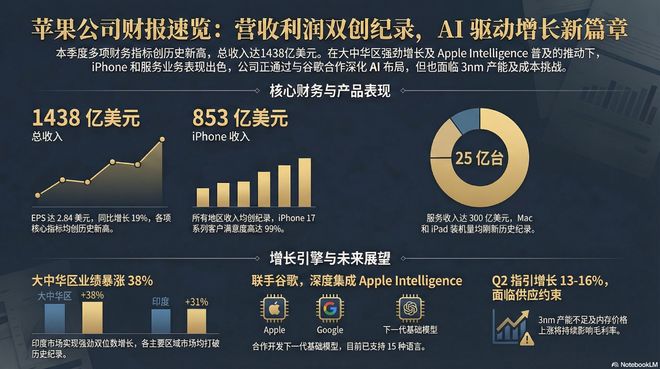 1 月 29 日,苹果公司发布 2026 财年第一财季(截至 2025 年 12 月 27 日)业绩报告显示,总营收、iPhone 收入、服务收入等多项指标创下历史新高。在全球科技股押注“AI+ 硬件换机”的背景下,市场对苹果这份假日季财报的关注点集中在三件事:iPhone 17 的换机强度能否延续、中国需求是否真正回暖、以及在内存涨价与先进制程产能紧张的情况下,苹果能否守住利润率与供给节奏。