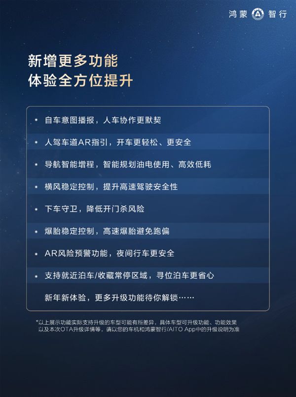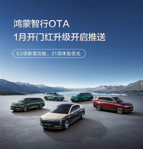 1 月 30 日消息,今天,华为鸿蒙智行迎来年度首次 OTA 升级,此次推送覆盖尊界、问界、享界、尚界等车型,带来 63 项新增功能与 31 项体验优化。