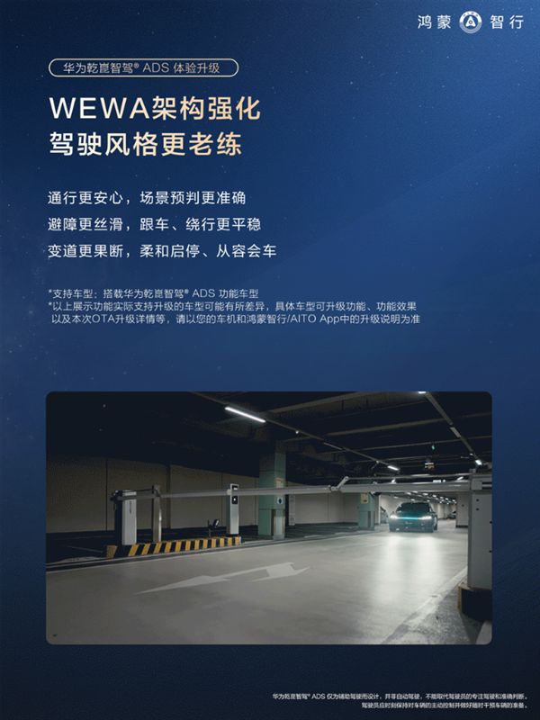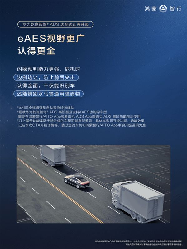 此次升级聚焦驾驶安全,强化 WEWA 架构,让跟车、变道更平稳果断。eAES 功能升级后闪躲预判能力更强,危机时边刹边让,防止前后夹击,还可识别水马等障碍。