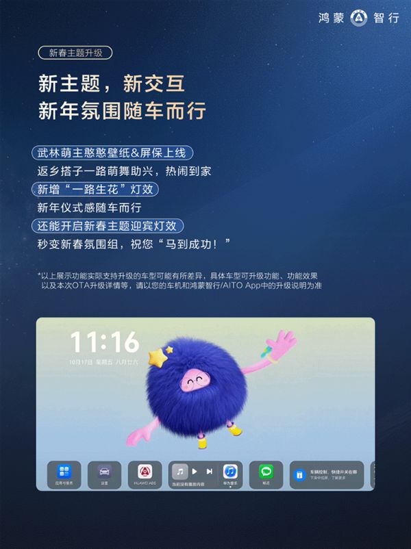 新增"组队出行"功能,多车可实时共享位置、语音对讲。新春主题则带来"武林萌主"壁纸、"一路生花"灯效,迎宾灯语还能开启新春主题,让车内充满年味。