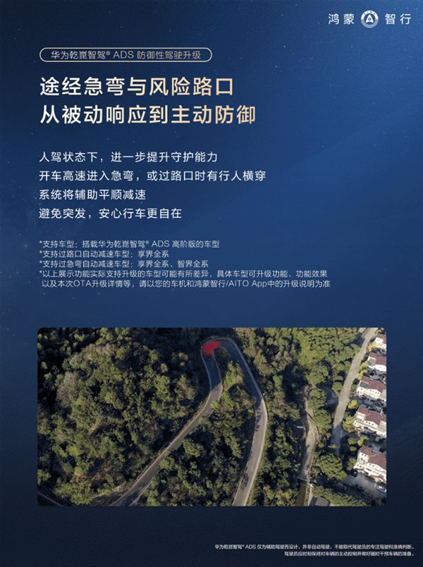 防御性驾驶新增急弯、路口主动减速,人驾状态下也能同步守护。同时加入了爆胎稳定控制、AR 风险预警等功能。