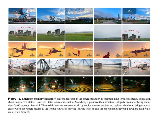 比如下图第 5 行中,离开画面的车辆在未被观测的情况下仍会继续其运动轨迹,并在物理上合理的位置重新出现。这就表明,该模型模拟的是现实世界中潜在的时空一致性,而非简单地记忆像素数据。