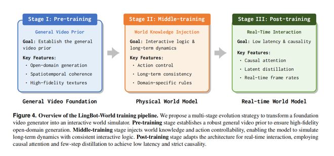 在这个训练流程中,第一阶段(预训练)会建立一个通用视频先验。第二阶段(中期训练)会注入世界知识;第三阶段(后训练)则是实现低延迟与严格因果关系。