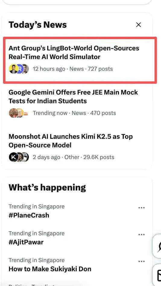 才没过多久,X上已经被 LingBot-World 刷屏了,直接登顶了热搜榜的 TOP 1。