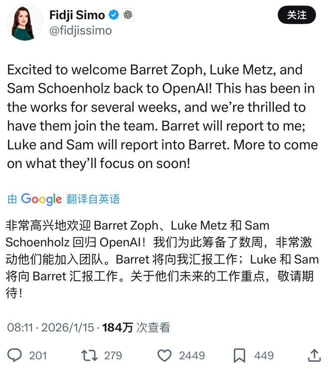 图注:OpenAI 应用 CEO Fidji Simo 发帖“开香槟”欢迎 Zoph 和另外两位成员回归 OpenAI