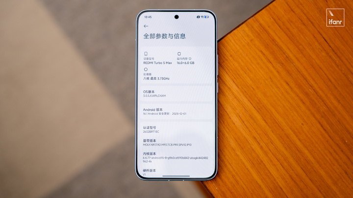 来到性能部分,REDMI Turbo 5 Max 搭载了天玑 9500s 移动平台,配备 LPDDR5X Ultra 和 UFS 4.1 储存组合,室内常温状态下跑分为 3249023。
