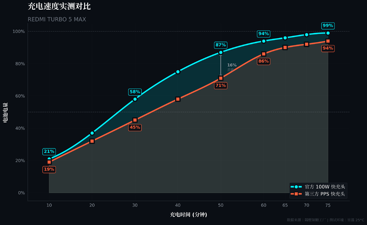 根据隔壁制糖工厂录得的数据,分别使用原装的 100W 小米快充头和第三方高功率 PPS 快充头,红米 Turbo 5 Max 的实际满充速度几乎是肩并肩的: