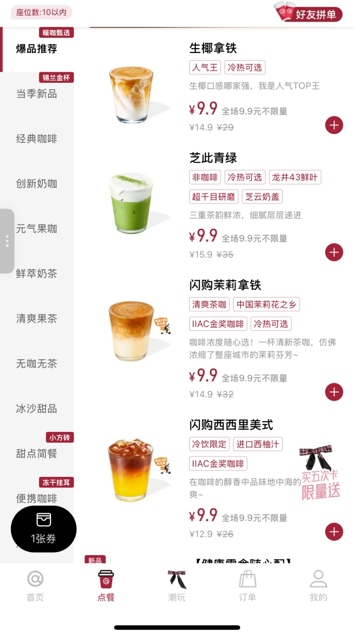 此外,新店首月 8.8 元活动自 2 月 1 日 0 时起调整,用户扫码可得券包由原先的 3 张 6.9 元饮品券(全场饮品可用)调整为 3 张 8.8 元饮品券(全场饮品可用)。邀新有礼活动也有所调整,新用户奖品由原先的 3 张 8.8 元全场任饮券调整为 3 张 9.9 元全场任饮券。