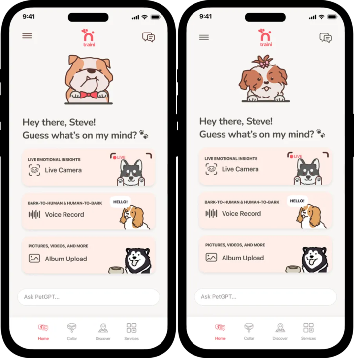 在项圈上市前,Traini App 已凭借其犬语翻译功能,流行于养宠人之间。用户只需上传宠物狗的叫声、图片和视频,就能获知狗狗的快乐、恐惧、疑惑等 12 种情绪,也可以将“看这里”“集中注意力”等 18 个短句转换成犬吠声。