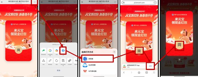 红包领取方式:用户可在活动页面内直接抽取红包,或通过好友分享的红包链接、复制好友的红包口令并在元宝 App 内打开等方式领取。