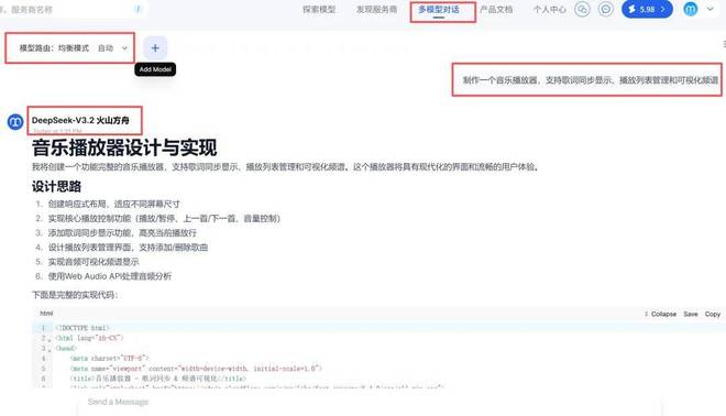 我们简单体验了一把「自动驾驶」,在网页「多模型对话」中,让系统完成一个音乐播放器的设计。