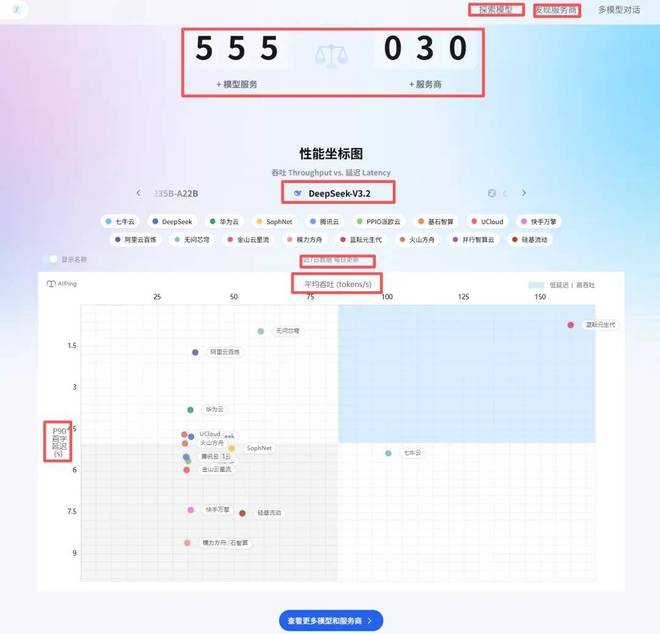 在 AI Ping 的网站首页,不同服务商被放入同一张性能坐标图中进行对比。以吞吐率与延迟为坐标轴,同一个模型在不同服务商处的实际服务能力差异,一目了然。