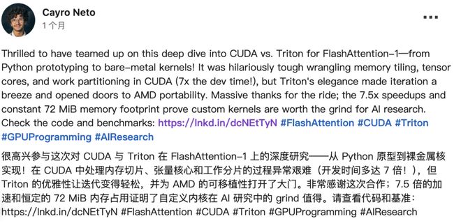 开发者实测,在 Transformer 注意力内核等场景,代码量比 CUDA 减少 75-90%,性能媲美甚至局部超 CUDA 5-37%。