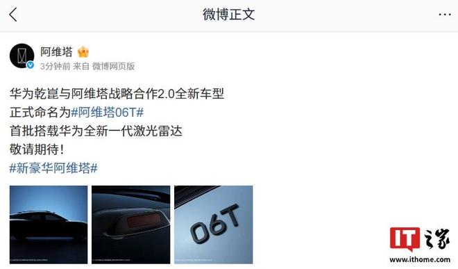 2 月 3 日消息,阿维塔官方今日宣布,华为乾崑与阿维塔战略合作 2.0 全新车型正式命名为阿维塔 06T,将首批搭载华为全新一代激光雷达。